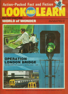 Posted on October 4, 2025October 4, 2025The Mind Controller (continued . . .) As the day wore on, panic reigned among the guards of the prison isle. I’ve just been down to feed the convict Roffa, sir, and he’s disappeared, too ! Another gone ? It’s an organised conspiracy ! Safe on their lofty perch, Janno, Roffa and Raspardi looked down. We’ve got those fools really worried. Quiet ! my voice has begun speaking to me. The voice that he could not disobey sounded in Janno’s inner ear. You, Janno, will descend from the tower after dark. You will destroy the island’s anti-aircraft capability. Here is how you will do it . . . At about that time, the great scientist Peric had sought an urgent audience with the Emperor. Your Majesty, we have found the scientific notebooks of the missing physician, Torga ! Torga is a master technician, who has devised a way of manufacturing a radio receiver so small that it can actually be injected into the blood stream. This done, the receiver will lodge itself in the cells of the inner ear. Peric continued . . . “Torga recounts how Janno and Roffa were subjected to faked road accidents and taken to hospital. On the way there, both were given blood transfusions by Torga and both transfusions contained miniaturised receivers !” “With the receivers in place, all Torga had to do was to bend his victims’ wills, day and night, by hypnosis, beamed directly to their brains by a secret radio wavelength !” Janno, when you wake up, you will do exactly as I shall order you. Do you understand ? I . . . under- stand . . . At the end of Peric’s account, Trigo put a question. Why did Torga go to all that trouble, in order to turn those two into criminals ? So that they would be sent to the Isle of Despair ! Where they have just freed the arch-criminal Raspardi ! That night, obedient to his inner voice, Janno made the perilous descent of the black tower. Unseen, he tampered with the fuse mechanism of the first projectile in the anti-aircraft battery . . . . . . When that was done, he returned to his eyrie. At dawn, a strange craft approached the prison isle. Craft entering forbidden zone now ! Prepare to fire ! Fire ! This installment was originally published in Look and Learn issue no. 716 on 4 October 1975.