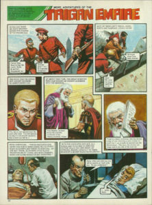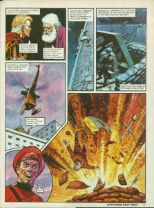 Posted on September 20, 2025September 21, 2025The Mind Controller (continued . . .) Keren continued the account of Janno’s accident. “Janno never had a chance. he smashed straight into the other fellow.” “By a near- miracle, he escaped with his life. An ambulance was quickly on the scene.” “Janno was rushed back to the hospital.” His condition calls for an immediate blood transfusion. Keren finished his story and added a comment which brought a gleam of interest to the wise old eyes of his companion. As we all know, Janno made a good, quick recovery. But here’s the interesting part . . . The physician who attended him at the scene of the accident was the same fellow who attended Roffa. His name—Torga ! An immediate call to the hospital brought a negative reply. The physician Torga has been missing for several days. Get on to the police ! Tell them to find Torga ! A description of the missing physician was flashed to all corners of the sprawling Trigan Empire. . . . Height seventeen thrumms, weight one hundred and three sarnas. Fresh complexion. No special distinguishing features. Meanwhile, back on the dread isle of Despair, in the grim prison-fortress that crowned its craggy heights . . . Janno and Roffa both heard the secret voice in their inner ears. You will now commence the next part of the master plan ! Obedient to the strange power that ruled their lives, the two unlocked the cell and left it—like guard and convict. In this manner, they reached the courtyard without meeting anyone. The black tower ! inside that tower is the object of all our efforts ! And here’s how we get into the tower. Listen . . . Some time later, Janno stepped out of the shadows and was challenged. Halt ! Who approaches ? Then Roffa leapt from above like a bird of prey. Uuuuuuh ! Unlocking the massive door of the black tower, the two comrades entered. And Janno addressed the prisoner who stood within. We have come to rescue you ! This instalment was originally published in Look and Learn issue no. 714 on 20 September 1975.