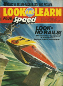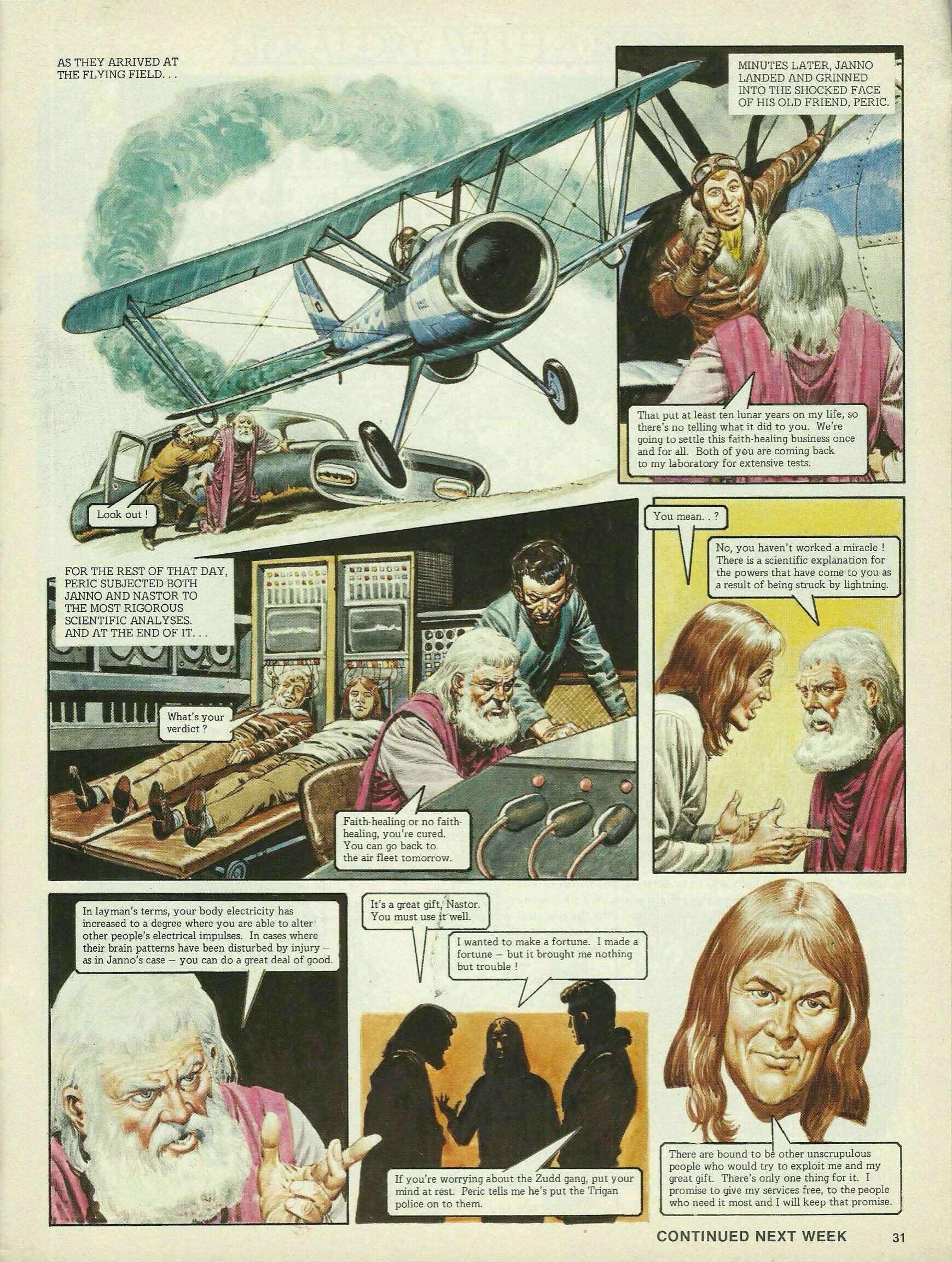Posted on November 22, 2025November 22, 2025The Gambler’s Gift (continued . . .) The richly appointed reception room was filled with a roar of devastating sound. When it was all over, Zudd stated his terms. It breaks my heart to have to do this to you, Nastor. But I’m going to have to increase my percentage of your profits from seventy-five to ninety per cent. I’ll call around for the first payment next week. Meanwhile, the great scientist Peric was carrying out his private enquiries into the past career of Nastor the ‘healer’. You say that the child used to suffer from headaches, but that they have lessened since Nastor attended him ? I keep telling you that. Don’t you believe me ? Later, Peric stalked, unannounced, into Nastor’s home. Who are you ? I am Peric the scientist, and I have a notion that you are one of the biggest scoundrels alive ! However, there is just an outside chance that you might be genuine. I am told that you can attract metals like a magnet. Show me ! Y-Yes. The demonstration took place. There ! Allowing for the fact that a tenth-rate illusionist could perform such a feat on the stage, even allowing for that, I am impressed. I became interested in you, my friend, when I learned that you had been tampering with Janno’s brain. Janno is a friend of mine, and if you have done him any harm with your quackery, I’ll see to it that you eke out your days in the punishment mines. On their arrival at Janno’s family villa. Lord Janno has gone to the private flying field. He stated that his health was so much improved that he would try his hand at a few stunts. Quick ! Back into the car ! We must stop him ! As they arrived at the flying field . . . Look out ! Minutes later, Janno landed and grinned into the shocked face of his old friend, Peric. That put at least ten lunar years on my life, so there’s no telling what it did to you. We’re going to settle this faith-healing business once and for all. Both of you are coming back to my laboratory for extensive tests. For the rest of that day, Peric subjected both Janno and nastor to the most rigorous scientific analyses. And at the end of it . . . What’s your verdict ? Faith-healing or no faith- healing, you’re cured. You can go back to the Air Fleet tomorrow. You mean . . ? No, you haven’t worked a miracle ! There is a scientific explanation for the powers that have come to you as a result of being struck by lightning. In layman’s terms, your body electricity has increased to a degree where you are able to alter other people’s electrical impulses. In cases where their brain patterns have been disturbed by injury — as in Janno’s case—you can do a great deal of good. It’s a great gift, nastor. You must use it well. I wanted to make a fortune. I made a fortune—but it brought me nothing but trouble ! If you’re worrying about the zudd gang, put your mind at rest. Peric tells me he’s put the Trigan police on to them. There are bound to be other unscrupulous people who would try to exploit me and my great gift. There’s only one thing for it. I promise to give my services free, to the people who need it most and I will keep that promise. This instalment was originally published in Look and Learn issue no. 723 on 22 November 1975.