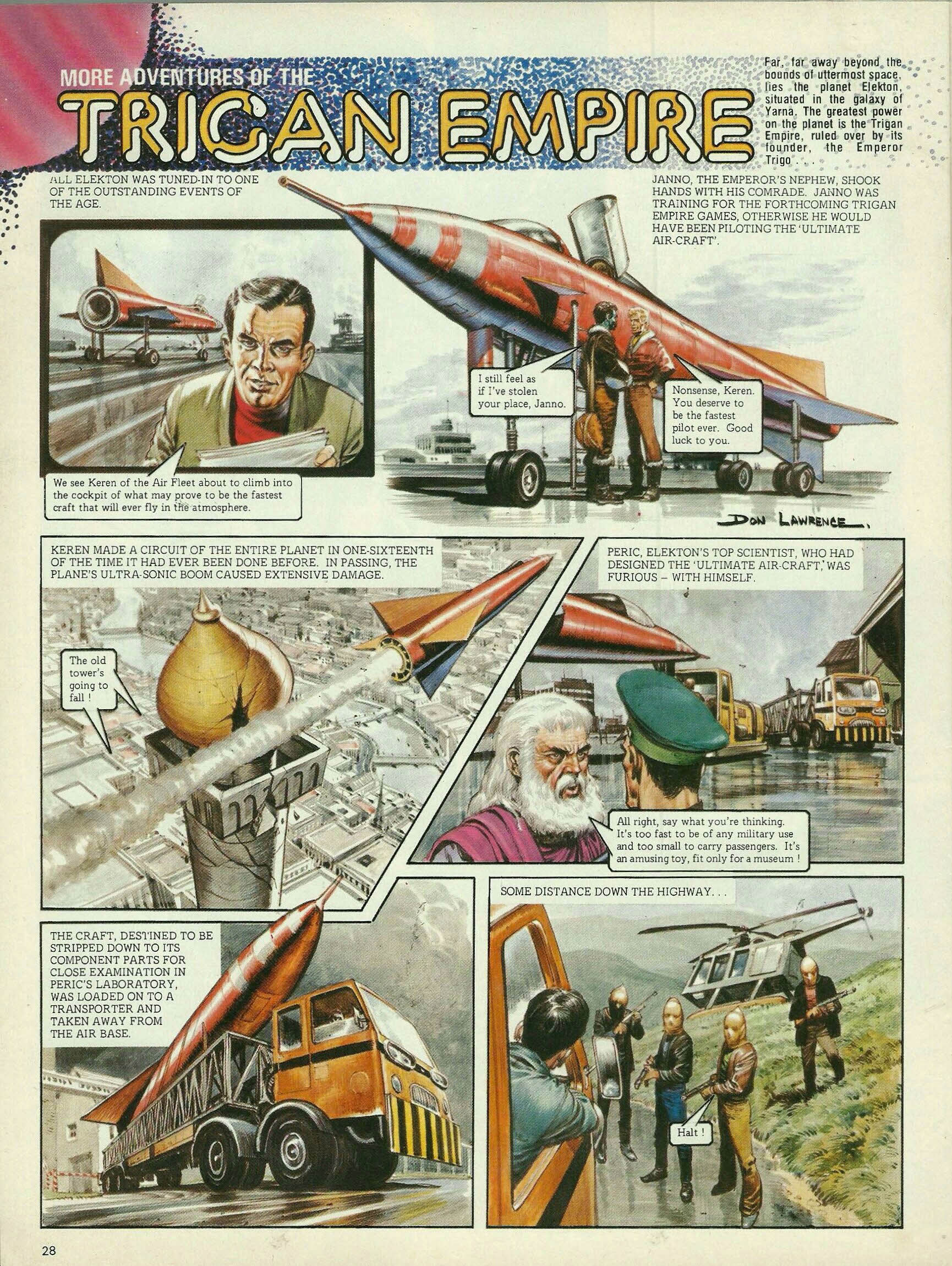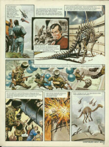 Posted on November 29, 2025November 29, 2025The Ultimate Collection All Elekton was tuned-in to one of the outstanding events of the age. We see Keren of the Air Fleet about to climb into the cockpit of what may prove to be the fastest craft that will ever fly in the atmosphere. Janno, the Emperor’s nephew, shook hands with his comrade. Janno was training for the forthcoming Trigan Empire games, otherwise he would have been piloting the “Ultimate Aircraft”. I still feel as if I’ve stolen your place, Janno. Nonsense, Keren. You deserve to be the fastest pilot ever. Good luck to you. Keren made a circuit of the entire planet in one-sixteenth of the time it had ever been done before. In passing, the plane’s ultra-sonic boom caused extensive damage. The old tower’s going to fall ! Peric, Elekton’s top scientist, who had designed the “Ultimate Air-craft”, was furious—with himself. All right, say what you’re thinking. It’s too fast to be of any military use and too small to carry passengers. It’s an amusing toy, fit only for a museum ! The craft, destined to be stripped down to its component parts for close examination in Peric’s laboratory, was loaded on to a transporter and taken away from the air base. Some distance down the highway . . . Halt ! The unarmed crew of the transporter looked on while the “Ultimate Aircraft” was attached to the heli-jet and carried skywards. The snatching of the wonder plane was a sensation throughout Elekton at first, but as the lunar months went by, another sensation claimed the attention of the masses. Here, on this site in the wilderness of Vorg, has been uncovered the fossilised remains of the earliest four-legged creature to inhabit our planet . . . the Monster of Vorg ! “The Monster of Vorg” was exhibited in a specially constructed building in Trigan City. It became one of the sights of the planet. Several weeks later, from out of a peaceful sky, a force of armed warriors descended. Acting swiftly and ruthlessly dealing with the slightest opposition, they cleared visitors from the vast building that housed the monster. Aaaagh ! Explosive charges brought the transparent roof crashing down. Then, from out of the wreckage rose “the Monster of Vorg !” This instalment was originally published in Look and Learn issue no. 724 on 29 November 1975.