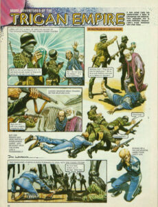 Lipka let out a wail of anguish as one of the guards picked up the Great Green Diadem. We’ll cut this up and dispose of it. It will fetch enough money to keep us in luxury for the rest of our lives. No! Do not harm The diadem! It is utter perfection! He was felled by a brutal blow. Babbling fool! What do we care for perfection? We’ve done your bidding, and now we’re taking our payment. Loaded weapons were trained on the helpless pair. And now we’ll still your wagging tongues for ever! But one person had been entirely overlooked—Janno. And he burst upon the scene like a thunderbolt. Uuuuuuugh! Eeeeeeeeeeghh! The remaining guards rushed forward to deal with the young Trigan. He must have broken out of his cage. Seize him! Picking up a fallen weapon, Janno took hasty aim.