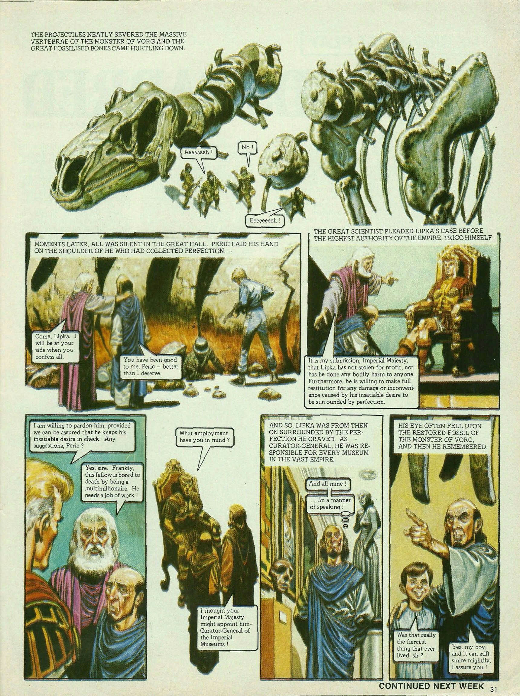 The projectiles neatly severed the massive vertebrae of the Monster of Vorg and the great fossilised bones came hurtling down. Aaaaaaah! No! Eeeeeeeeh! Moments later, all was silent in the great hall. Peric laid his hand on the shoulder of he who had collected perfection. Come, Lipka. I will be at your side when you confess all. You have been good to me, Peric—better than I deserve. The great scientist pleaded Lipka’s case before the highest authority of the empire, Trigo himself. It is my submission, Imperial Majesty, that Lipka has not stolen for profit, nor has he done any bodily harm to anyone. Furthermore, he is willing to make full restitution for any damage or inconvenience caused by his insatiable desire to be surrounded by perfection. I am willing to pardon him, provided we can be assured that he keeps his insatiable desire in check. Any suggestions, Peric? Yes, Sire. Frankly, this fellow is bored to death by being a multimillionaire. He needs a job of work! What employment have you in mind? I thought your Imperial Majesty might appoint him—Curator-General of the Imperial Museums! And so, Lipka was from then on surrounded by the perfection he craved. As Curator-General, he was responsible for every museum in the vast empire. And all mine! . . . In a manner of speaking! His eye often fell upon the restored fossil of the Monster of Vorg, and then he remembered. Was that really the fiercest thing that ever lived, sir? Yes, my boy, and it can still smite mightily, I assure you!