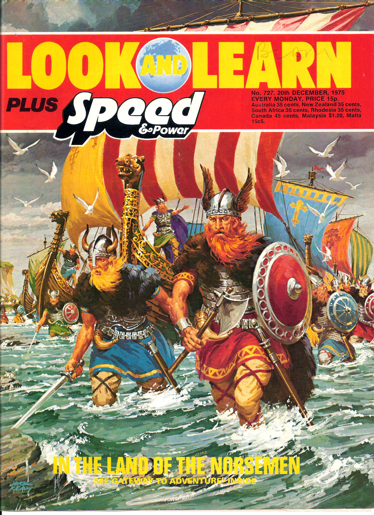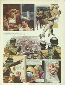 Posted on December 6, 2025December 9, 2025The Ultimate Collection (continued . . .) All Trigan City turned out to see the fossilised monster being carried off. They’ve got the Monster of Vorg ! The Air Fleet defences of the city were hastily sent up. Head for area three-five-one. Intercept, but do not open fire. Understood ? Order received and understood. Later . . . Leader of the interceptors reports they’ve lost contact sir. With a thing that size ? Impossible ! When it was all over, the experts went through the operation in detail and came up with a surprising conclusion. The thieves, whoever they are, made their escape in this direction. Shortly before passing the boundary of greater Trigan City, they disappeared from sight. So we estimate that “the Monster of Vorg” is still somewhere near at hand ! Speculation about the missing giant fossil was on everyone’s lips for a few days. The incident was then completely overshadowed by—the Trigan Empire Games ! People of the planet Elekton. We proudly present the twentieth Trigan Empire Games ! A star athlete and strong contender for the victor’s grand crown was Janno, the Emperor’s nephew. Competitors for the pole-climbing take your places. Good luck, Janno. Pole-climbing—the most physically-demanding and dangerous of all Elekton athletic events and Janno was the first to plant his flag. Then followed the ancient and traditional five-zarra foot race, the competitors bearing armour and weapons with Janno again the winner. Throwing the spear from a galloping kreed meant another win for Janno. With three firsts in main events and sundry other placings, the Emperor’s nephew was an outright winner of the victor’s grand crown. Well done, lad ! Thanks, Uncle ! It was while he was making a triumphal circuit of the stadium that . . . . . . It happened ! Uuuuuhhh ! Before a finger could be lifted to help him, the victor of the games was snatched into the sky. Janno ! This instalment was originally published in Look and Learn issue no. 725 on 6 December 1975.
