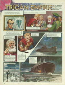 Posted on December 20, 2025December 21, 2025The Ultimate Collection (continued . . .) The fiendish cunning by which the diadem had been taken was the most sensational aspect of the news story. Following on an unsuccessful attack upon the temple, one of the thieves posed as the Abbot of Zemf, switched the diadem for a fake and made off with the true jewel ! The Emperor Trigo summoned an extraordinary session of the Imperial Council. Janno’s kidnapping and the various thefts are clearly the work of one will. But what is the reason behind it all, Peric ? Majesty, it is difficult to say. The great scientist pondered on his sovereign’s question. It is simple to guess the motive behind the kidnapping of a member of the Imperial Family. But what connection does that have with the theft of a pile of ancient fossilised bones ? Trigo’s retort was short and brutal. You will find that connection, Peric ! And you will work day and night till you do ! It was night. The great ocean liner “Emperor Trigo” was heading for port with a host of passengers. Danger lurked nearby. Prepare to surface and fire a warning projectile. The first warning of peril came with a thunderclap of sound, followed by a streak of lurid flame. They’re signalling us to halt, or else they’ll sink us ! Stop the ship ! A party of masked and ruthless raiders soon boarded the ship. See here, you animals ! I protest . . . Aaaaghh ! Silence ! Down into the palatial dining saloon, among the horrified passengers, they marched. They halted by a mild-looking individual who was eating alone. Get to your feet ! It’s you we’ve come for ! News of the outrage reached Trigan City before dawn. It was immediately passed to Peric, who had spent a sleepless night in his laboratory, puzzling his brain. What did you say ? Repeat the name of the kidnappers’ victim. A great light dawned in Peric’s mind. I’ve got it ! I’ve found the connection ! This instalment was originally published in Look and Learn issue no. 727 on 20 December 1975.