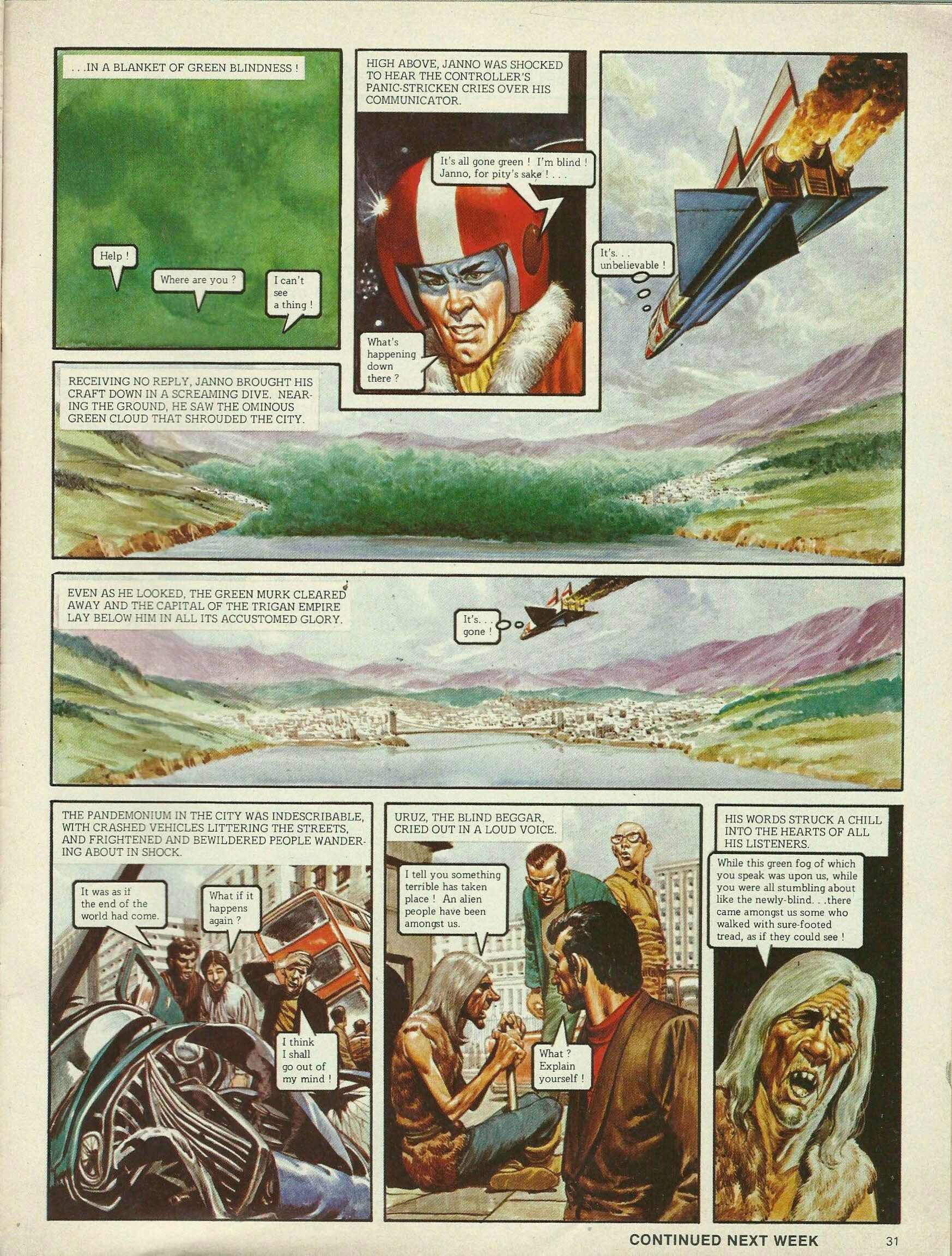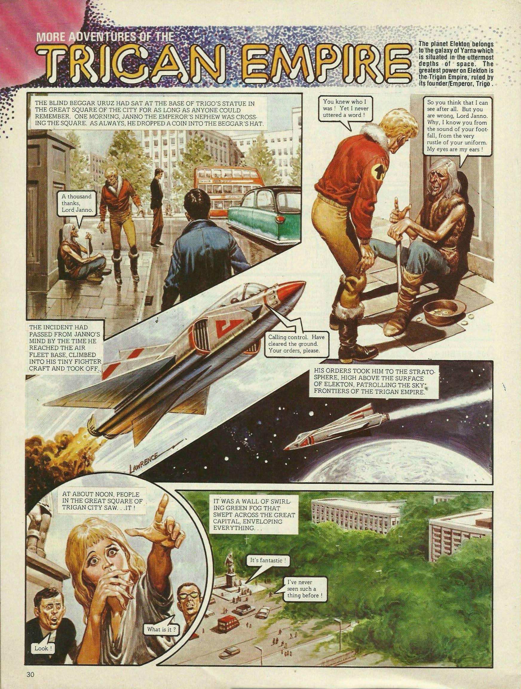 The blind beggar Uruz had sat at the base of Trigo’s statue in the great square of the city for as long as anyone could remember. One morning, Janno the Emperor’s nephew was crossing the square. As always, he dropped a coin into the beggar’s hat. A thousand thanks, Lord Janno. You knew who I was! Yet I never uttered a word! So you think that I can see after all. But you are wrong, Lord Janno. Why, I know you from the sound of your footfall, from the very rustle of your uniform. My eyes are my ears! The incident had passed from Janno’s mind by the time he reached the air fleet base, climbed into his tiny fighter craft and took off. Calling control. Have cleared the ground. Your orders, please. His orders took him to the stratosphere, high above the surface of Elekton, patrolling the sky frontiers of the Trigan Empire. At about noon, people in the great square of Trigan City saw . . . IT! Look! What is it? It was a wall of swirling green fog that swept across the great capital, enveloping everything . . . It’s fantastic! I’ve never seen such a thing before!. . . in a blanket of green blindness! Help! Where are you? I can’t see a thing! High above, Janno was shocked to hear the controller’s panic-stricken cries over his communicator. It’s all gone green! I’m blind! Janno, for pity’s sake! . . . What’s happening down there? Receiving no reply, Janno brought his craft down in a screaming dive. Nearing the ground, he saw the ominous green cloud that shrouded the city. It’s . . . unbelievable! Even as he looked, the green murk cleared away and the capital of the Trigan Empire lay below him in all its accustomed glory. It’s . . . gone! The pandemonium in the city was indescribable, with crashed vehicles littering the streets, and frightened and bewildered people wandering about in shock. It was as if the end of the world had come. What if it happens again? I think I shall go out of my mind! Uruz, the blind beggar, cried out in a loud voice. I tell you something terrible has taken place! An alien people have been amongst us. What? Explain yourself! His words struck a chill into the hearts of all his listeners. While this green fog of which you speak was upon us, while you were all stumbling about like the newly-blind . . . there came amongst us some who walked with sure-footed tread, as if they could see!