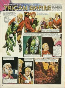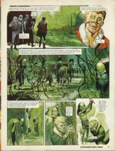 Janno was on the alert day and night. The next sinister visitation of the rolling green fog came shortly after midday. Here it comes, Janno! Put on your eyepiece, and good luck, son! Janno peered out at the murk through the transparent screen. I . . . I can see . . . them! They came from out of the sewers and the water-courses, from holes in the ground and from long-forgotten cellars. An uncountable host of the alien creatures, moving barefoot and silent through the fungus-hung city. Labouring by hand, they cut down the masses of green fungus and carried it away on their backs. It’s just as Peric said. They’re gathering the foul stuff! And then, the young Trigan’s world fell apart in a blinding flash of agony. Uuuuuugh!