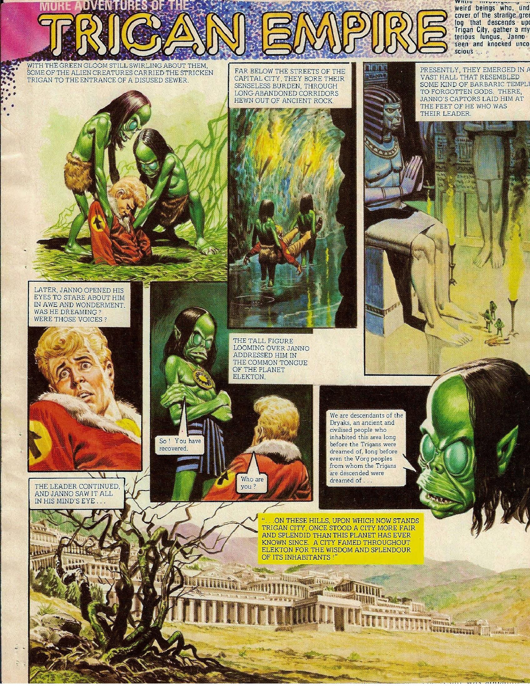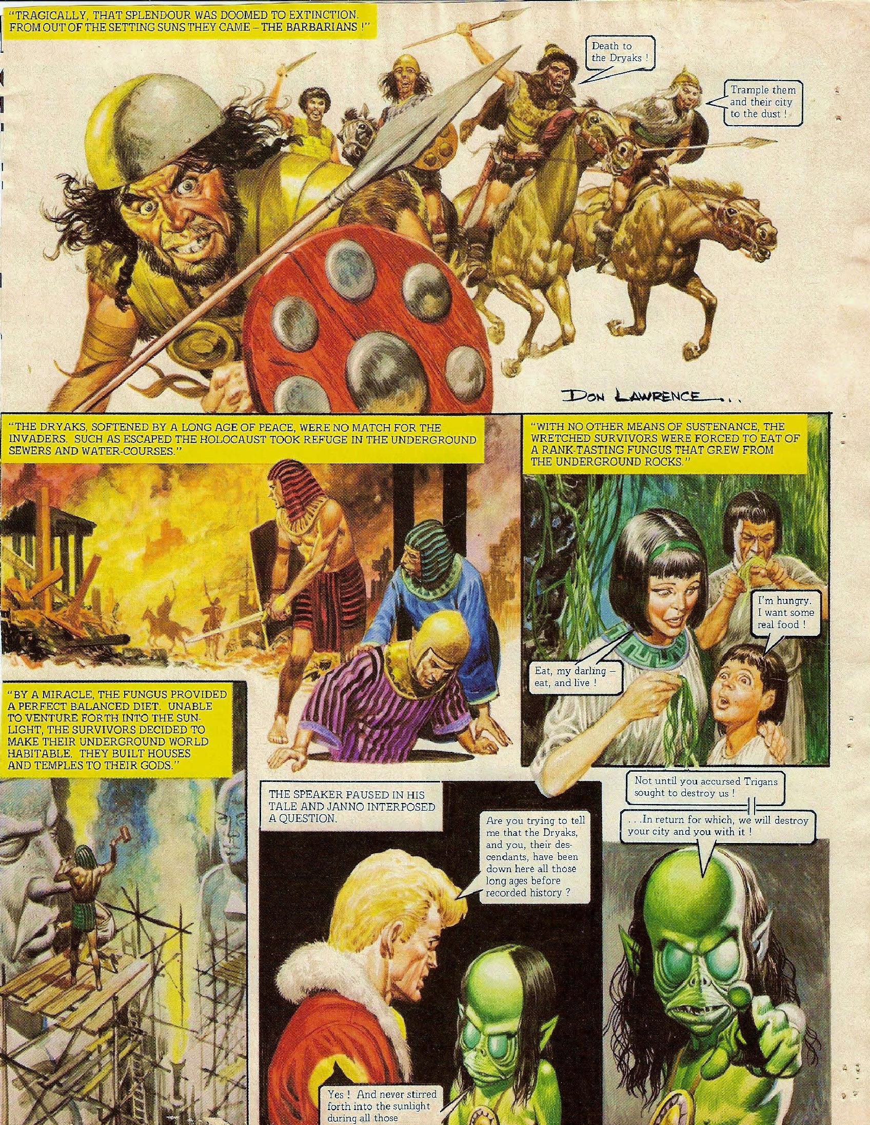 With the green gloom still swirling about them, some of the alien creatures carried the stricken Trigan to the entrance of a disused sewer. Far below the streets of the capital city, they bore their senseless burden, through long-abandoned corridors hewn out of ancient rock. Presently, they emerged in a vast hall that resembled some kind of barbaric temple to forgotten gods. There, Janno’s captors laid him at the feet of he who was their leader. Later, Janno opened his eyes to stare about him in awe and wonderment. Was he dreaming? Were those voices? The tall figure looming over Janno addressed him in the common tongue of the planet Elekton. So! You have recovered. Who are you? We are descendants of the Dryaks, an ancient and civilised people who inhabited this area long before the Trigans were dreamed of, long before even the Vorg peoples from whom the Trigans are descended were dreamed of . . . The leader continued, and Janno saw it all in his mind’s eye . . . “. . . On these hills, upon which now stands Trigan City, once stood a city more fair and splendid than this planet has ever known since. A city famed throughout Elekton for the wisdom and splendour of its inhabitants!”“Tragically, that splendour was doomed to extinction. From out of the setting suns they came—the barbarians!” Death to the dryaks! Trample them and their city to the dust! “The Dryaks, softened by a long age of peace, were no match for the invaders. Such as escaped the holocaust took refuge in the underground sewers and water-courses.” “With no other means of sustenance, the wretched survivors were forced to eat of a rank-tasting fungus that grew from the underground rocks.” Eat, my darling — eat, and live! I’m hungry. I want some real food! “By a miracle, the fungus provided a perfect balanced diet. Unable to venture forth into the sunlight, the survivors decided to make their underground world habitable, they built houses and temples to their gods.” The speaker paused in his tale and Janno interposed a question. Are you trying to tell me that the Dryaks, and you, their descendants, have been down here all those long ages before recorded history? Yes! And never stirred forth into the sunlight during all those countless centuries. Not until you accursed Trigans sought to destroy us! . . . In return for which, we will destroy your city and you with it!